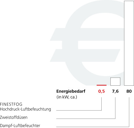 Zum Zerstäuben des Wassers zu feinsten Aerosolen wird weder Druckluft noch Ventilatoren benötigt. Um 100 Liter Wasser zu zerstäuben, benötigt FINESTFOG einen Energiebedarf von rund 1 KW. Im Vergleich dazu benötigt eine mit Druckluft zerstäubende Anlage dafür ca. 9 KW und ein Dampfluftbefeuchter gar 85 KW.